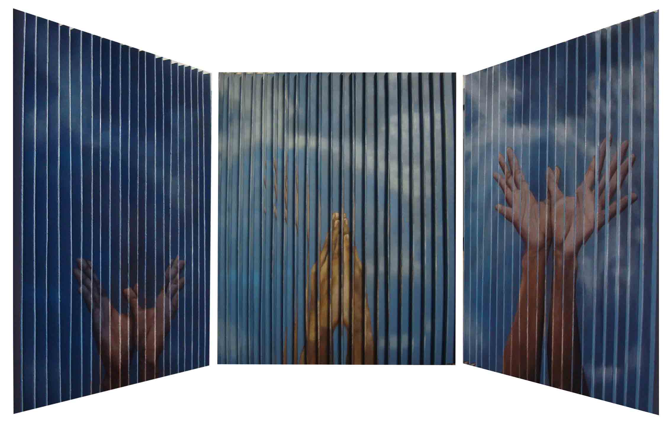 Roxas is straightforward in the semiotics of his works, the signals of which are deliberate references.” It has always been his particular strategy after all to incorporate texts in his works. For the meantime in this series he spells them out through physical gestures of the hand and facial demonstration. As with the sign language pieces, they unravel to form the words spelling out landscapes and juxtaposed with rhetoric. Examples are the rural for “iiwanan”, by the sea “kakalimutan” to urbanscape “babalikan”. Likewise, the titling of his paintings clearly defines the anamorphic actions that confront our navigation through the slats of each work. These define how destiny unfolds as a navigation – “Departure” implicating the fulfillment of dreams and the migration involved in searching for the former while “Arrival” implicates a journey coming to a close.